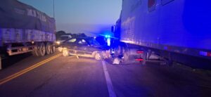Al llegar al lugar, los agentes constataron que uno de los vehículos involucrados era un camión Scania H360, dominio HSE-xxx, con acoplado BFG-xxx, conducido por Anastacio A., de 51 años, domiciliado en la ciudad de Reconquista, Santa Fe. Según su testimonio, el camión se encontraba estacionado sobre la banquina, en sentido descendente, cuando sintió un impacto en el lateral derecho.