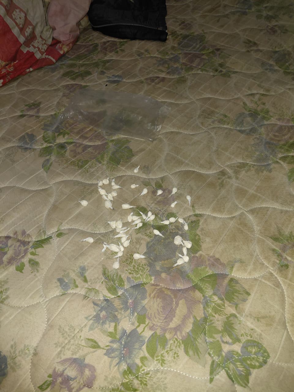 Recortes varios de polietileno, utilizados para fraccionar la sustancia.