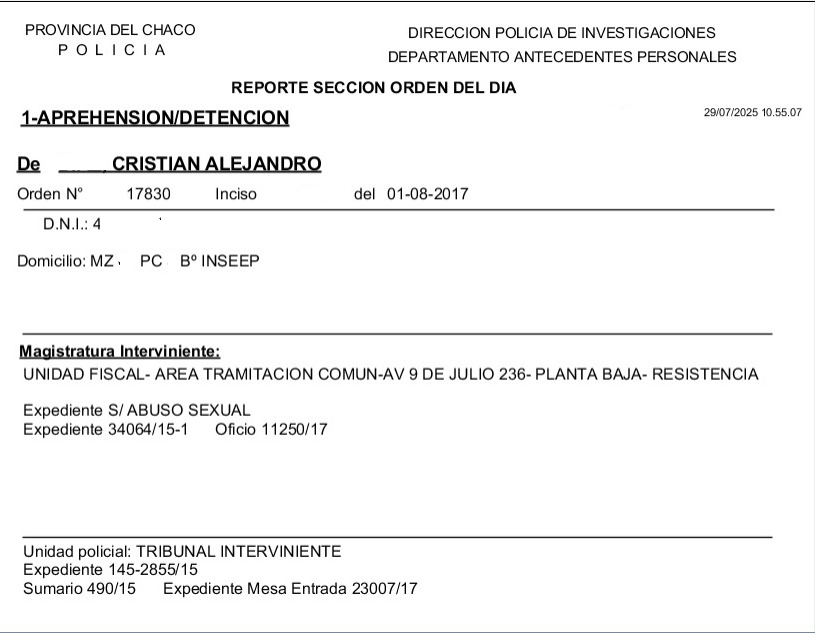 El joven fue identificado como Cristian Alejandro D., de 26 años de edad, con domicilio en el barrio INSSSEP. Al profundizar la consulta con la División de Antecedentes Personales, se confirmó que la orden de detención se encuentra vigente desde el 1 de agosto de 2017, en el marco de la Causa «S/ ABUSO SEXUAL», tramitada bajo el expediente N° 145-2855/15, correspondiente a la Orden del Día N° 17.830, Inciso 13.