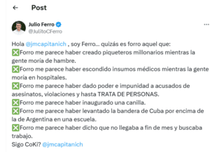 La réplica del primer candidato a diputado por el Frente «Chaco Puede + La Libertad Avanza»Julio Ferro, se dio por su cuenta oficial en X (ex Twitter). Textualmente respondió: Hola @jmcapitanich. Soy Ferro… quizás es forro aquel que: