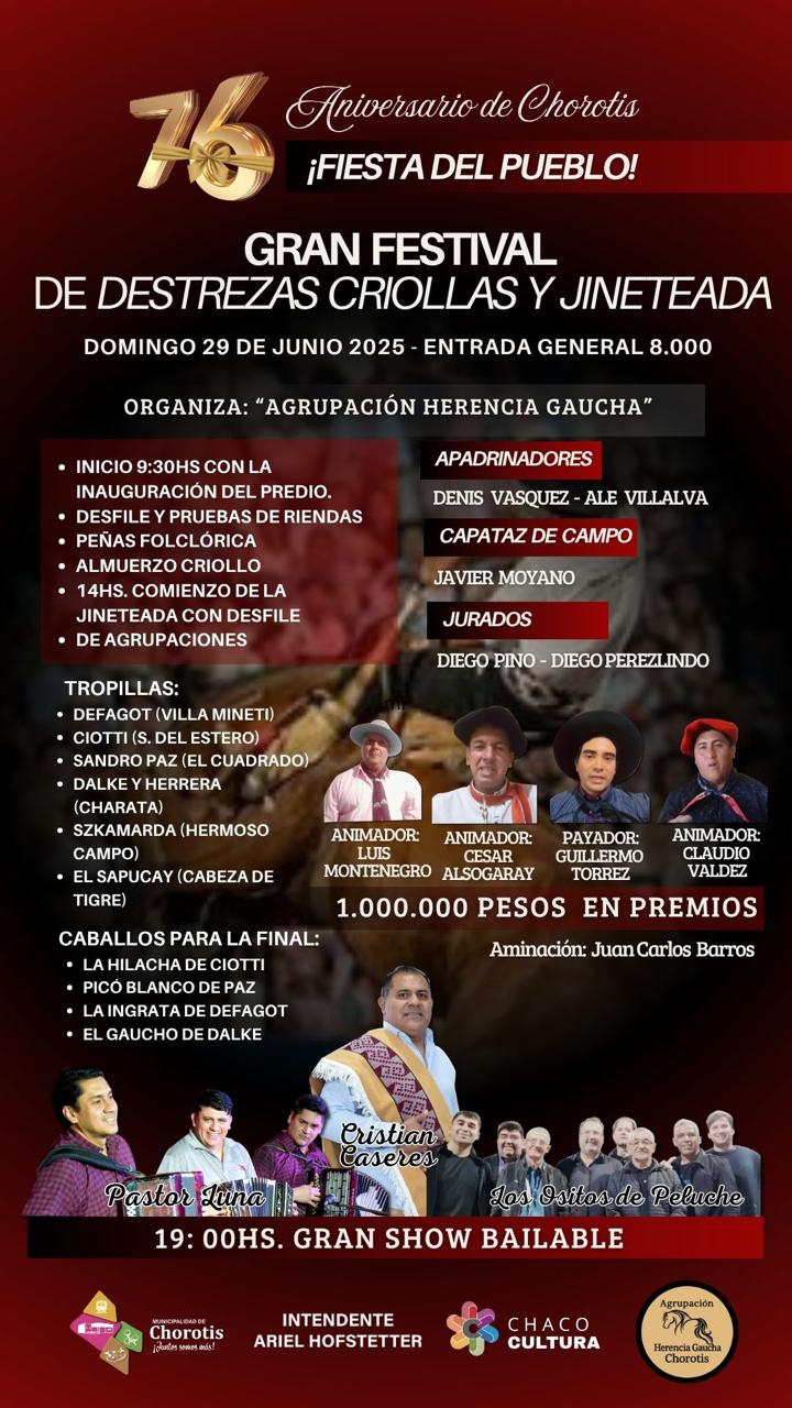 También se confirmó la presencia del gobernador Leandro Zdero, quien solicitó especialmente estar en el acto central. “Que venga el gobernador a una localidad tan alejada como la nuestra nos llena de orgullo. Somos 900 personas, y sin embargo hoy Chorotis está en el centro de la escena”, expresó Hofstetter.