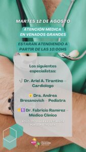 En esta oportunidad, el próximo martes 12 de agosto se realizará una jornada especial de salud en Venados Grandes, a partir de las 10:00 horas, con la presencia de un equipo de especialistas que atenderán en forma gratuita.