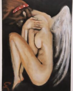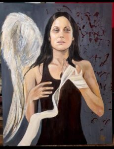 Lejos de la idea de una producción desligada de la vida, Martínez entiende la pintura como una vía de canalización emocional. “Uno se inspira mucho más cuando la está pasando mal. Tengo una obra de una mujer-ángel con un ala rota, con sangre, con las manos vendadas… cuando la pinté pensé que transmitía fuerza y reconstrucción, pero en realidad lo inconsciente se filtró y apareció una tristeza muy profunda”.