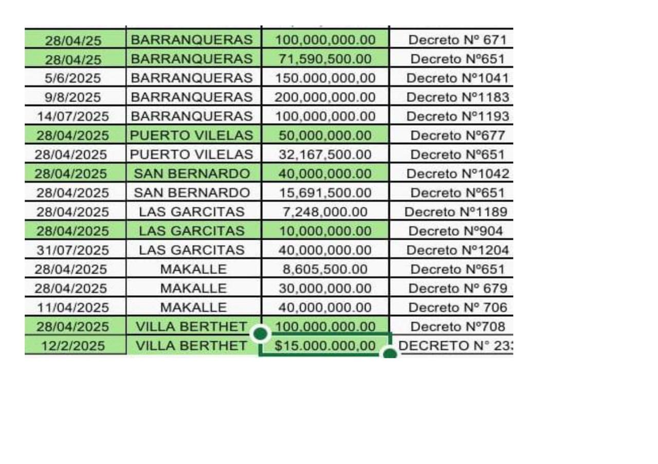 La intendenta agregó que otras localidades también fueron alcanzadas por aportes, entre ellas Las Garcitas —cuyo intendente es el candidato a diputado nacional Sergio Dolce—, San Bernardo, Puerto Vilelas (aliado a Fuerza Patria) y Makallé, que responde políticamente al Nepar. “A modo de ejemplo, adjuntamos la planilla con los números de decreto de los fondos enviados”, indicó.
