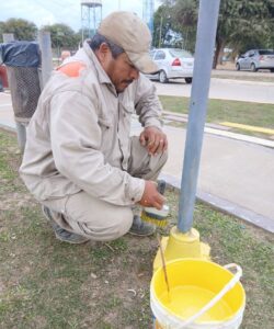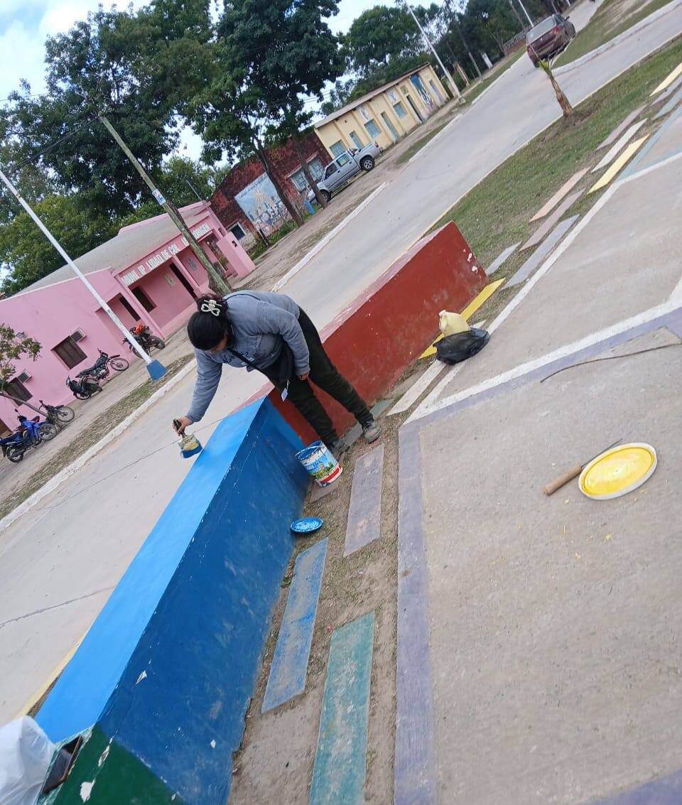 El personal municipal de Colonia Aborigen llevó adelante esta semana tareas de pintura y limpieza en la rotonda central de la comunidad, un espacio de encuentro donde las familias y amigos comparten momentos al aire libre.