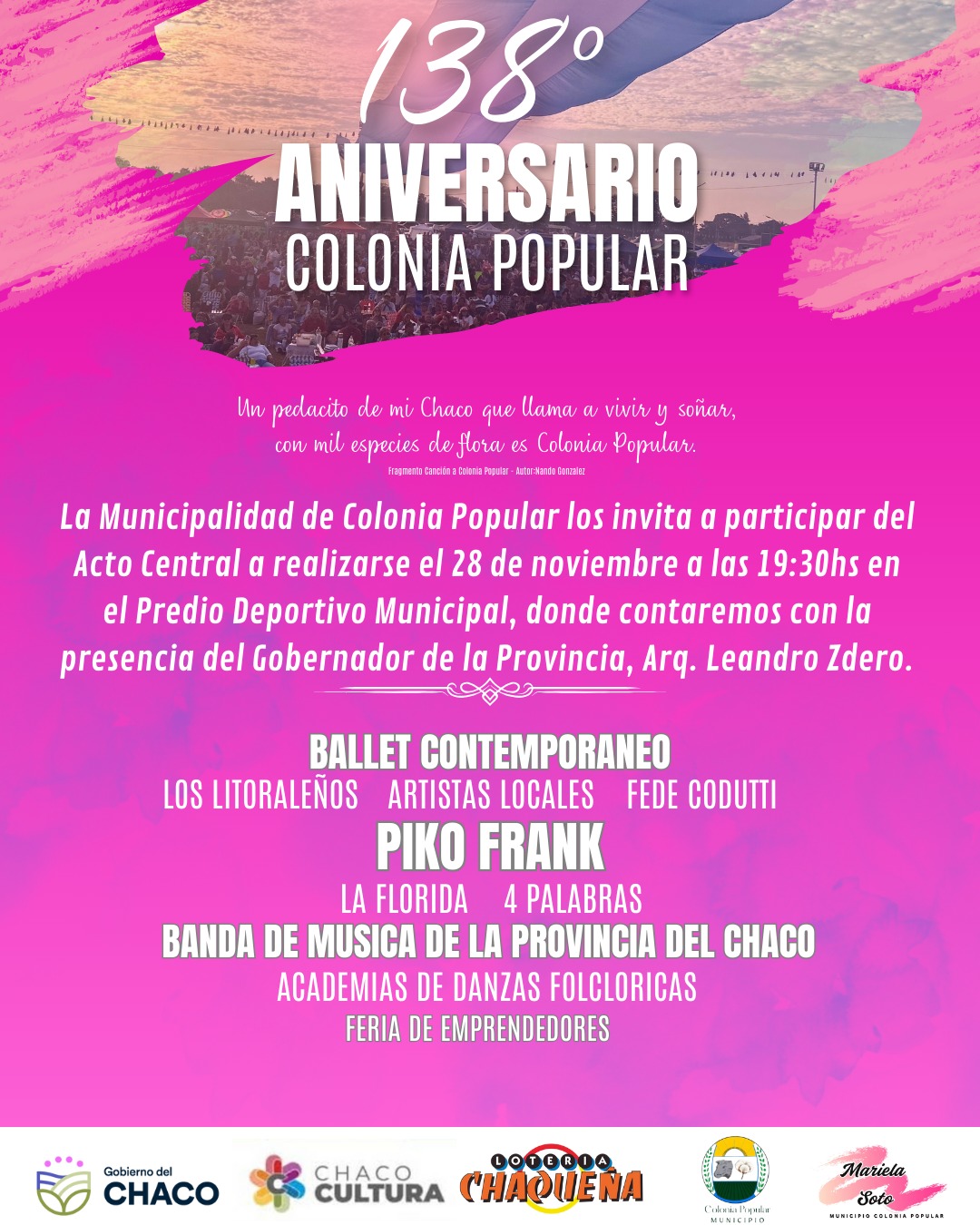Colonia Popular se prepara para celebrar este viernes su 138° aniversario, una fecha significativa para la comunidad que será acompañada por diversas actividades oficiales y culturales. La intendente Mariela Soto adelantó que el acto central comenzará a las 19:30, con la participación del gobernador Leandro Zdero, funcionarios provinciales y jefes comunales de la región.