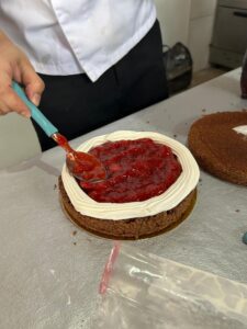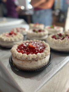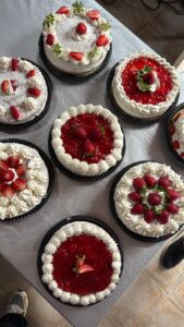 A pesar de la mañana lluviosa, el encuentro se desarrolló en un ambiente cálido y participativo, donde las y los asistentes elaboraron un Mini Cake de crema y frutillas, fruta elegida por su presencia en la zona, combinando técnica, creatividad y productos locales.