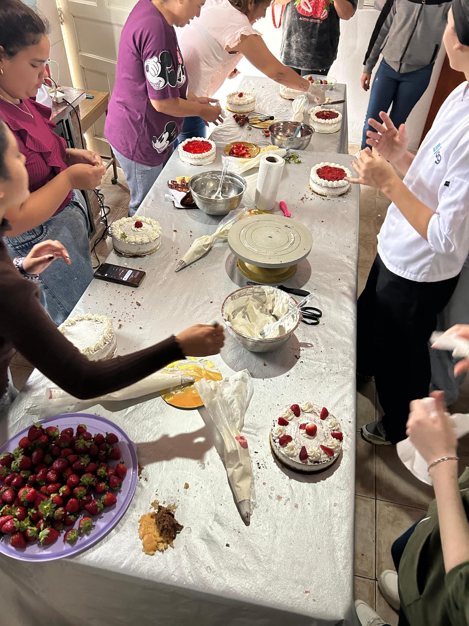 A pesar de la mañana lluviosa, el encuentro se desarrolló en un ambiente cálido y participativo, donde las y los asistentes elaboraron un Mini Cake de crema y frutillas, fruta elegida por su presencia en la zona, combinando técnica, creatividad y productos locales.