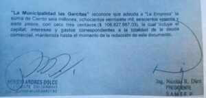Según consta en documentación oficial, la cooperativa municipal tuvo dos años de gracia para no abonar el servicio a SAMEEP, aunque continuó cobrando el agua a los vecinos.