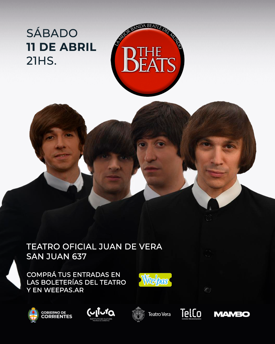 La reconocida banda tributo a The Beatles, The Beats, llega a Corrientes para brindar una noche única cargada de nostalgia, música y emoción. El esperado espectáculo tendrá lugar el próximo 11 de abril a las 21 horas en el Teatro Oficial Juan de Vera (San Juan 637). Las entradas ya se encuentran disponibles a través de weepas.ar y también pueden adquirirse en el punto de venta oficial ubicado en las boleterías del teatro.