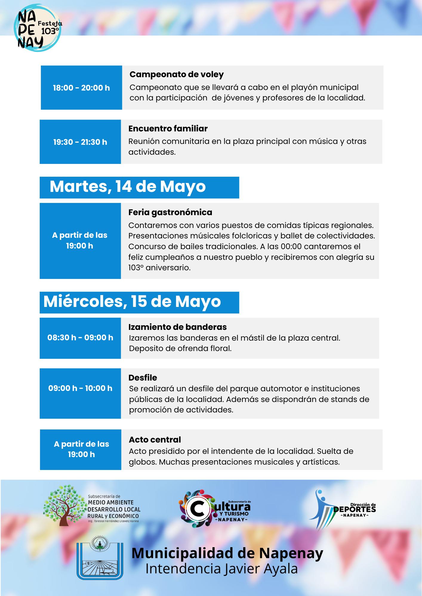 Hoy 15 de mayo Napenay celebra su 103° por tal motivo el intendente Javier Ayala y todas la autoridades municipales agradecer a cada uno de los habitantes que hacen grande a este pueblo día a día.