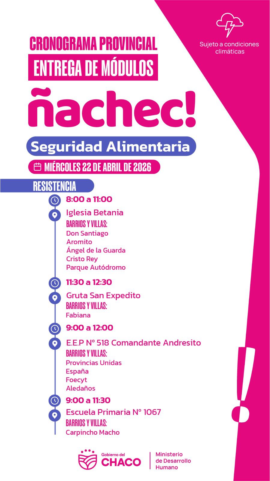 Este miércoles 22 de abril, el gobierno provincial realizará una nueva entrega de módulos alimentarios en Resistencia, a través del programa Ñachec, con distribución en centros comunitarios, iglesias y espacios barriales para familias de distintos sectores de la ciudad. El operativo está sujeto a condiciones climáticas, por lo que no se descartan modificaciones en caso de mal tiempo .