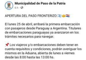 De esta manera la localidad de Paraguay Paso Patria y Paso de la Patria de Argentina tendrán el servicio – por ahora – de una embarcación que realizará – según se dijo – viajes diarios desde Paraguay con ida y vuelta.