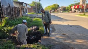 Las tareas están a cargo de agentes municipales, quienes intervienen en la zona con el objetivo de mejorar el escurrimiento del agua y prevenir posibles anegamientos ante condiciones climáticas adversas.