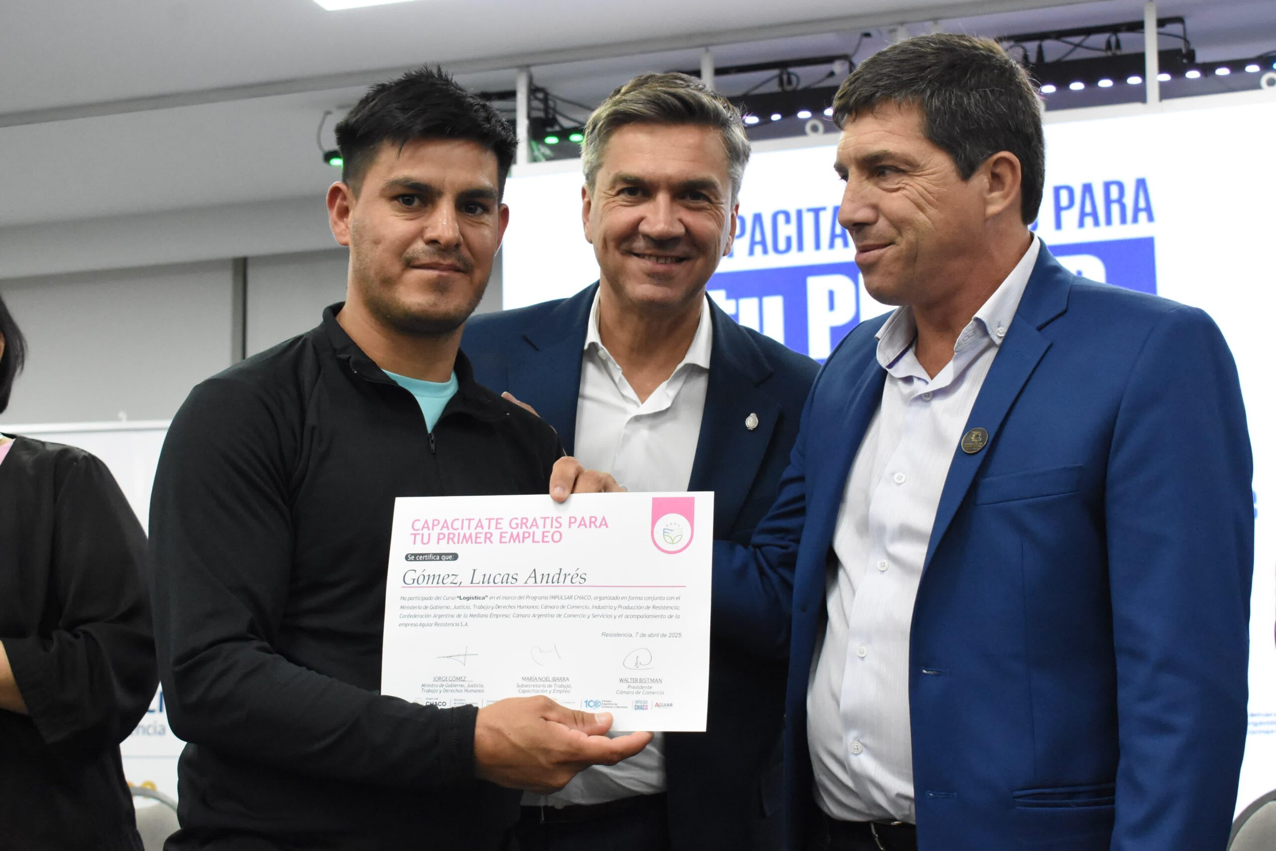 El gobernador Leandro Zdero, acompañado por el Ministro de Gobierno, Justicia, Trabajo y Derechos Humanos, Jorge Gómez, y la subsecretaria de Trabajo Noel Ibarra, entregaron los certificados de “Tu Primer Empleo” en el marco del Programa “Impulsar Chaco” a 243 personas que durante el mes de marzo se capacitaron en Ventas y Atención al Cliente, Administración y Logística, y serán incorporadas a la Bolsa de Trabajo de la plataforma “Impulsar Empleo”.