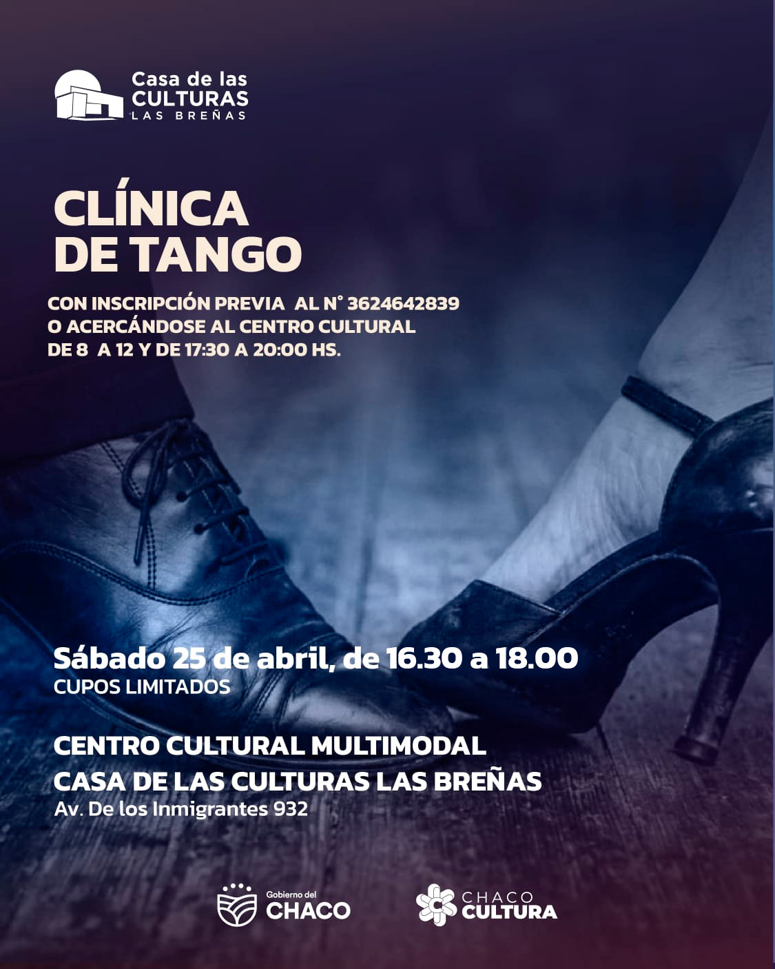La Casa de las Culturas de Las Breñas (Av. De los Inmigrantes 932) en articulación con el Departamento de Danzas, ambos dependientes del Instituto de Cultura del Chaco, abrió la inscripción para un taller de folklore y una clínica de tango, propuestas que se desarrollarán este sábado 25 de abril.
