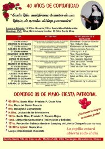 El día de la celebración y fiesta patronal en honor a Santa Rita, habrá misa desde las 00 del domingo 22 de mayo y la Iglesia estará abierta todo el día.