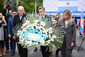 El gobernador Leandro Zdero junto al intendente Roy Nikisch encabezaron, este viernes, el acto por el Día de la Bandera nacional en homenaje a su creador Manuel Belgrano, en el Mástil Mayor de Resistencia. Debido a las inclemencias del tiempo y con el objetivo de cuidar la salud de los alumnos que iban a realizar la Promesa de Lealtad, el Ministerio de Educación, resolvió reprogramarla para el martes 24 de junio, en el Domo del Centenario.