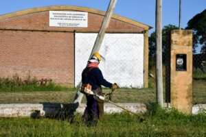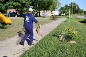 También se concretaron labores de limpieza general en accesos a la localidad, recolección de ramas, trabajos en el polideportivo municipal Américo Panzardi, con mantenimiento de techos, paredes y sanitarios, y tareas en el cementerio local, incluyendo limpieza del predio durante la jornada vespertina.