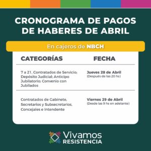 A partir de las 20:00 horas del jueves, se depositará el sueldo en los cajeros automáticos del Nuevo Banco del Chaco (NBCH) de las categorías 7 a 21, contratados de servicios, depósitos judiciales, anticipos jubilatorios, convenio con jubilados.