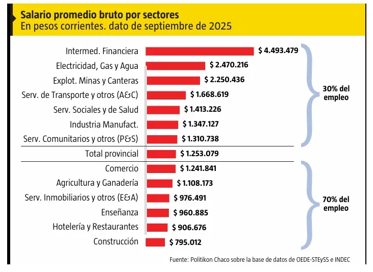 De acuerdo con datos de septiembre 2025, la Intermediación Financiera fue el sector con el mayor salario nominal bruto promedio, con $4.493.479. Le sigue Electricidad, Gas y Agua con $2.470.216, mientras que el podio se completa con Explotación de Minas y Canteras con $2.250.436.