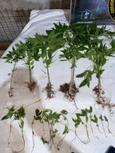 Cinco plantas de cannabis de unos 30 cm y 22 plantines de 10 cm.