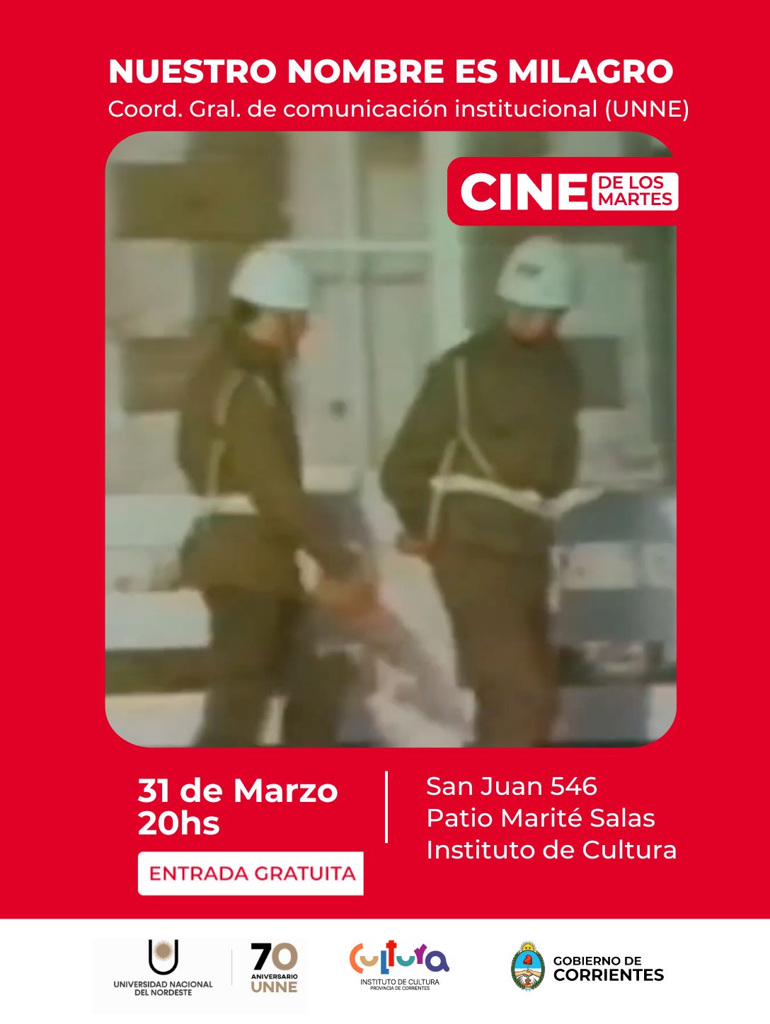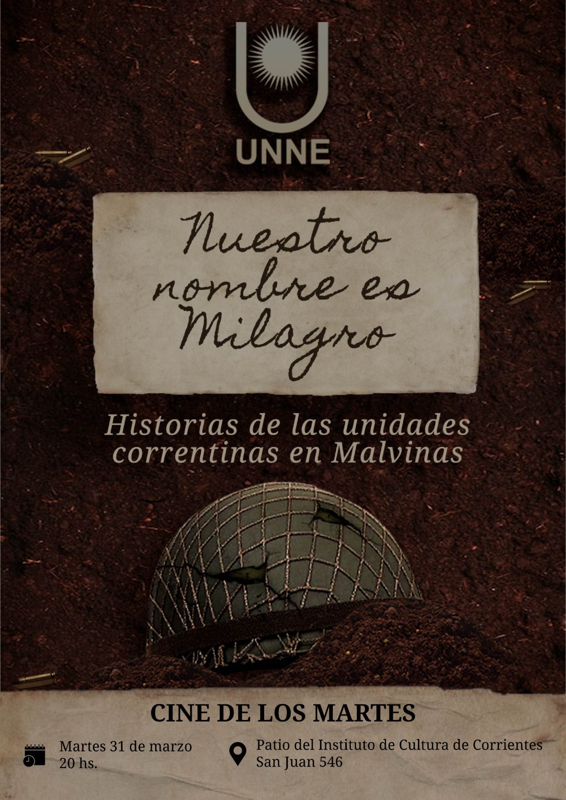 De cara al Día del Veterano y de los Caídos en la Guerra de Malvinas, se proyectará el documental de la UNNE sobre la guerra, en el cine del Instituto de Cultura de Corrientes. Será este martes 31 de marzo, a las 20 horas, en el marco del ciclo de “Cine de los martes”, en San Juan 546.