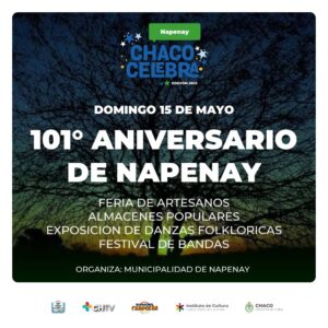 El intendente Gustavo Balbuena junto a su equipo de trabajo diagramó una serie de actividades para celebrar el 101° Aniversario de la localidad. Se tiene previsto que las actividades den inicio a las 14:0 con una feria de artesanos, feria de emprendedores, mercados populares, luego a las 18 se llevara a cabo el acto central en la Plaza Central de la localidad totalmente renovada. En la oportunidad se contara con la presencia de autoridades provinciales, autoridades locales e invitados especiales. Luego del acto protocolar se dará paso a los números artísticos con la actuación de Escuelas de Danzas Folklóricas y Bandas Musicales que aportaran color, alegría y ritmo al festejo. Balbuena invito a los vecinos de la localidad a sumarse a este festejo, “será un día para recordar a nuestros pioneros, nuestros primeros vecinos que tomaron la decisión de venir a instalarse en este pequeño lugar del Chaco par luego con el paso de los años y el aporte de su trabajo y sacrificio, hacer de Napenay una localidad reconocida y querida por todos y que año tras año va creciendo un poco más”.