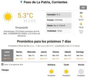 Mientras que para el cierre de la Pesca Internacional del Dorado en Paso de la Patria, la temperatura mínima se ubica en 18° y la máxima en 31°.