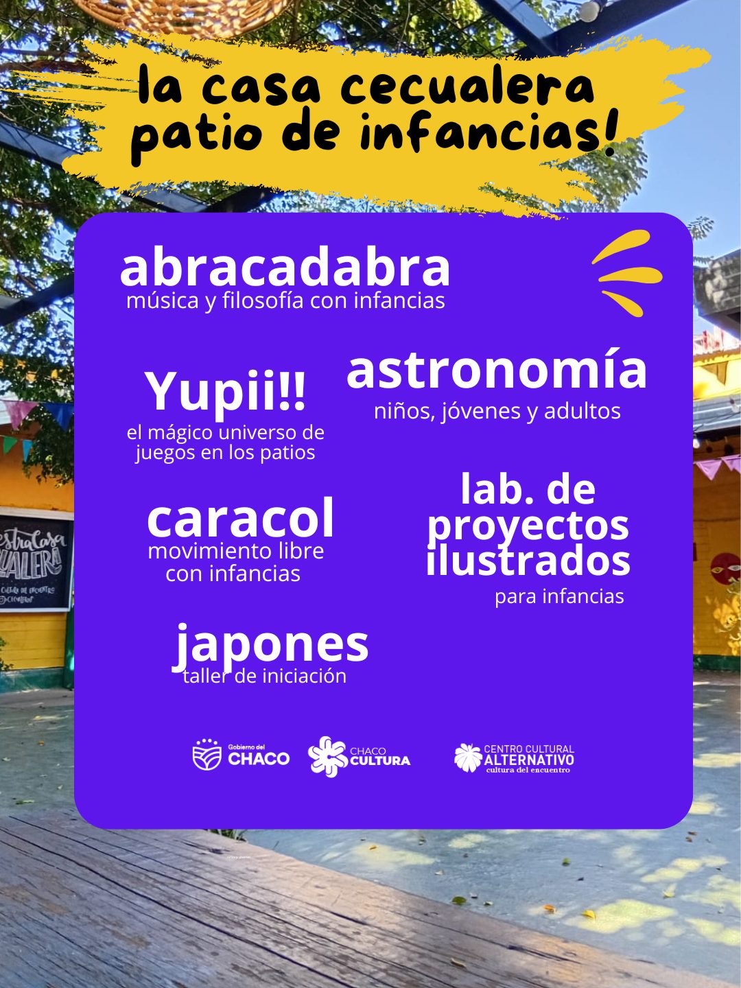 El Centro Cultural Alternativo del Instituto de Cultura del Chaco, invita a la comunidad a conocer y participar de sus diversas propuestas infantiles. Con el lema «Cecual, patio de Infancias», la casa cecualera despliega un universo de propuestas para explorar, jugar, crear y pensar con las infancias.