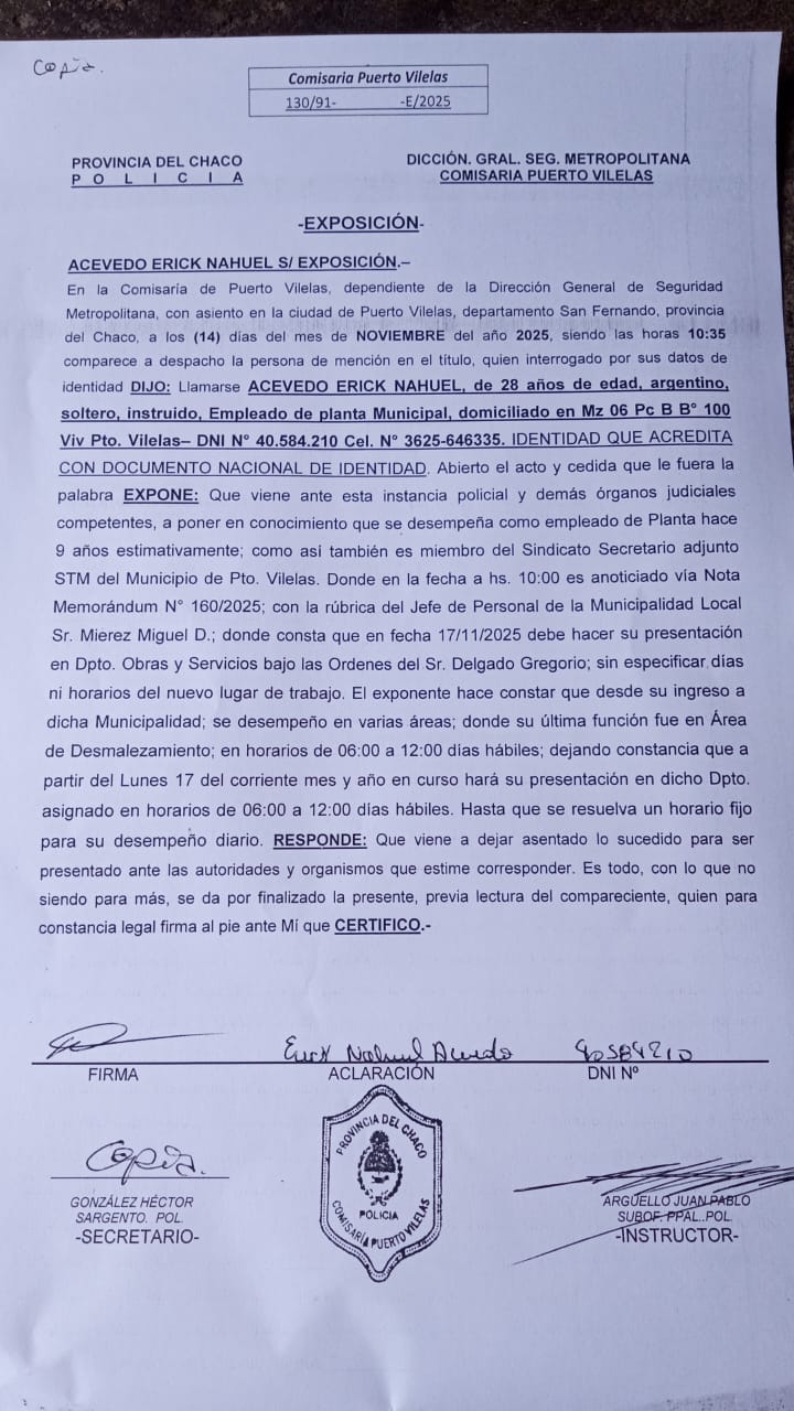 Ante la falta total de información, Acevedo se presentó en la comisaría para dejar asentado en una exposición policial que igualmente concurriría a trabajar, aunque desconoce cuál sería su nuevo horario laboral.