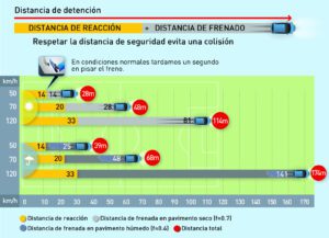 Distancia de reacción: Es la que se recorre en el tiempo que tardamos en percibir el peligro y frenar. A mayor velocidad, más metros.