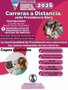 La Municipalidad de Presidencia Roca anunció la incorporación de nuevas carreras universitarias a distancia, en el marco del trabajo conjunto con la Universidad Nacional del Chaco Austral (UNCAUS), con el objetivo de ampliar las oportunidades de formación para jóvenes y adultos de la localidad.
