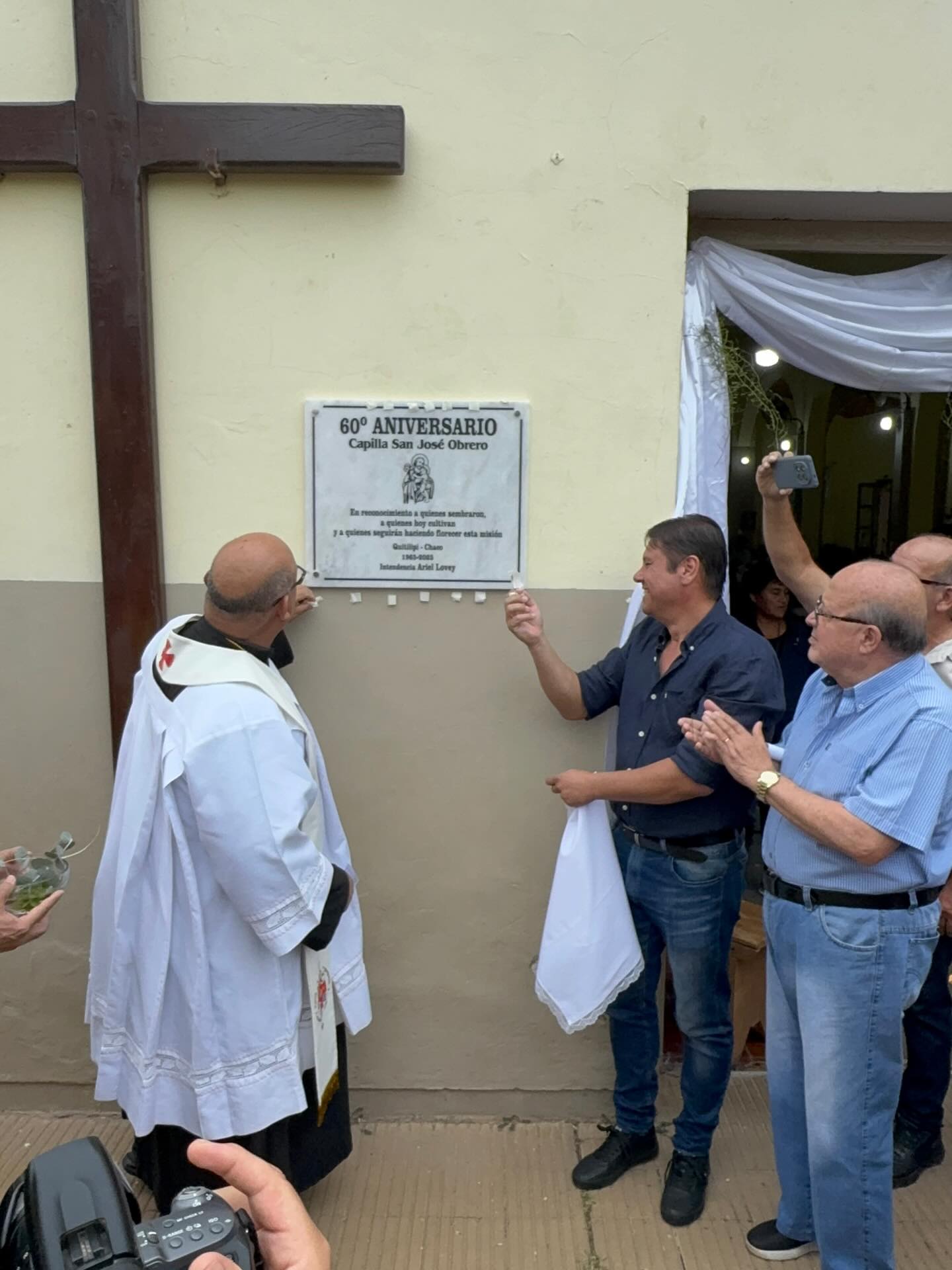 El acto conmemorativo reunió a vecinos, fieles y autoridades, entre ellos el intendente Ariel Lovey, quienes participaron de una ceremonia marcada por el reconocimiento a quienes forjaron los cimientos de la capilla.