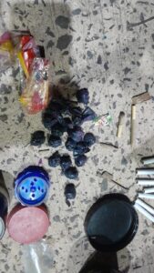 Durante el procedimiento, los agentes secuestraron una mochila negra, que contenía un frasco plástico color negro con 18 envoltorios de marihuana, dos cigarrillos armados, un picador plástico azul y una tijera de metal.