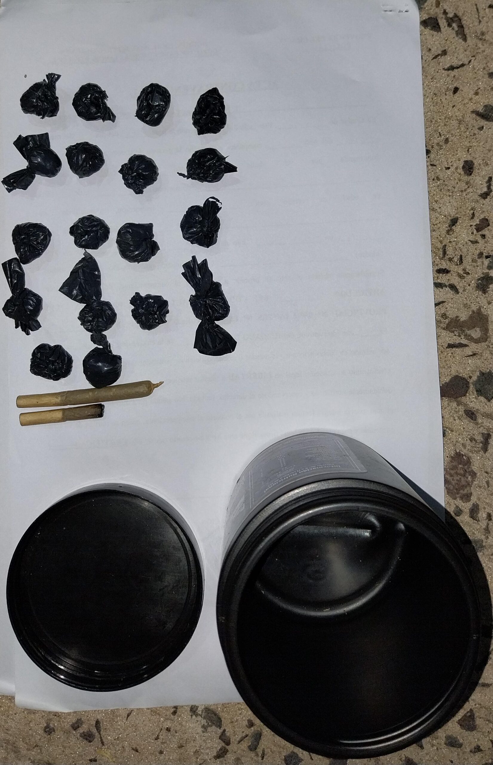 Durante el procedimiento, los agentes secuestraron una mochila negra, que contenía un frasco plástico color negro con 18 envoltorios de marihuana, dos cigarrillos armados, un picador plástico azul y una tijera de metal.
