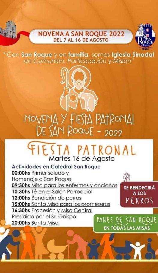 Para este martes, día del patrono, a la medianoche se realizará el primer saludo y homenaje a San Roque en la Catedral que lleva su nombre, a las 9.30 habrá una misa para los enfermos y ancianos, a las 10:30 se realizará un té en el Salón Parroquial. Asimismo, a las 12 los sacerdotes de la catedral realizarán la tradicional bendición de perros, a las 15 está programada una Santa Misa por los Promeseros, a las 16:30 Procesión y Misa Central presidida por Monseñor Hugo Barbaro.