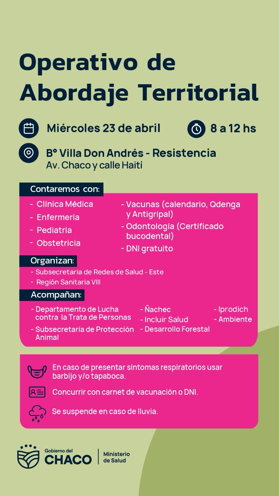 Los abordajes se realizarán este martes 22 en el Barrio Mujeres Argentinas y el miércoles 23, en Villa Don Andrés, de 8 a 12hs.